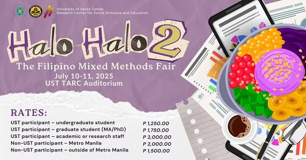 Interested participants can call UST’s RCSSED at rcssed@ust.edu.ph and halohalo.mixedmethods@gmail.com, through 02-87313535, and by searching the Facebook page “Halo-Halo: The Filipino Mixed Methods Fair.”